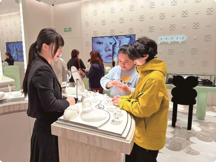 年轻女性在门店选购饰品。 当潮玩IP遇上精致珠宝,会碰撞出怎样的消费新场景?3月19日,泡泡玛特旗下轻奢珠宝品牌popop武汉万象城店开业,“Molly”“星星人”“Labubu…