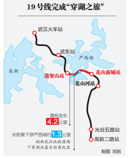 10月21日,经过1.3公里的湖下掘进,地铁19号线“铁龙号”盾构机成功穿越严西湖,抵达鼓架山站—花山新城站区间风井,这标志着19号线完成“穿湖之旅”,刷新了武汉地铁盾构下穿湖泊最长距离纪录。