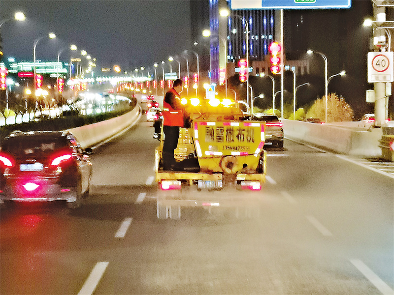 晚9时许,江汉城管在机场二通道、常青高架、城市主干道等重点路段,开始撒融雪剂,防止道路结冰。
