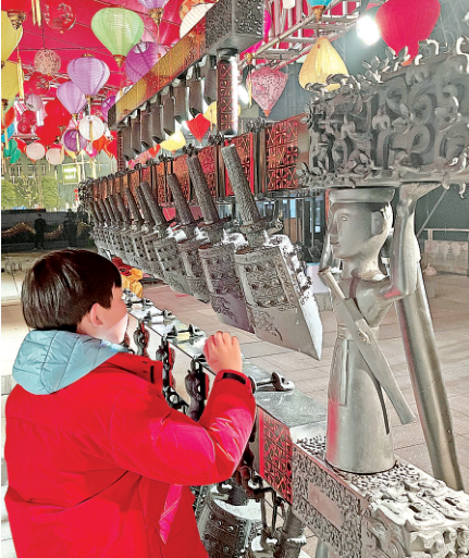据介绍,元宵夜,省博物馆主场打造沉浸式的观灯游园活动,策划具有浓郁荆楚文化特色的文化体验,组织一批穿汉服的青年男女和小孩互动,引领入场数千观众感受传统年俗,弘扬优秀传统文化。主体内容以省博中轴线延展,依次分为“瑞兽迎宾”“花灯集市”“点亮幸福生活”及“夜游博物馆”四个板块。