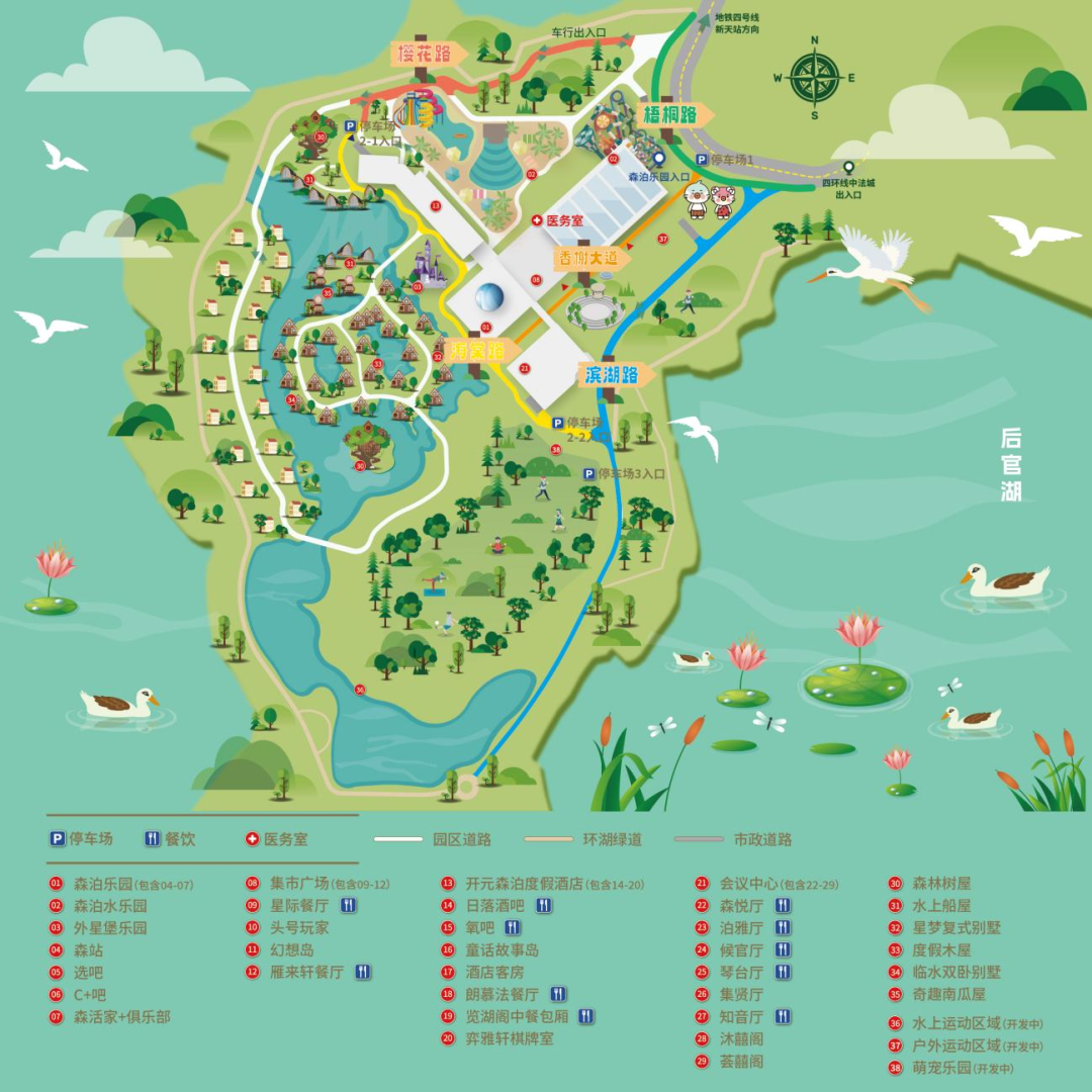 据介绍,武汉城建开元森泊度假乐园项目占地343亩,三面临后官湖,紧邻四环线中法城出入口,分两期建设。目前已完成一期建设,包括室内外水乐园、室内外儿童乐园、度假酒店、树屋及特色度假屋、国际会议中心以及配套的餐饮、商业、教育娱乐、停车等设施。