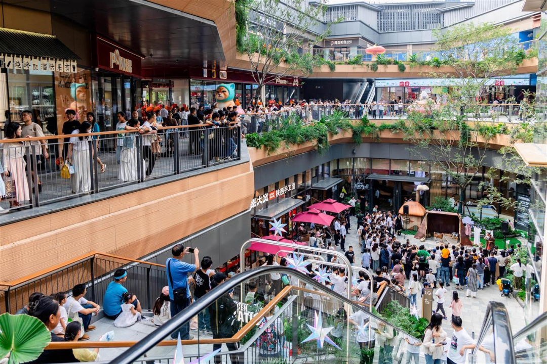 国庆假期首日客流量便突破12万人次的「武汉滨江天街」,同样为消费者提供了“在商场里逛公园”的全新体验。人们不仅能在绿地公园尽情嬉戏;在近三层楼高的“大树”下悠闲地品尝咖啡,沐浴在阳光里远眺美景;在多抓鱼循环商店里挑选二手好物;在宜家一站式打造“理想家”;还能打卡“这狗”IP全国首展。