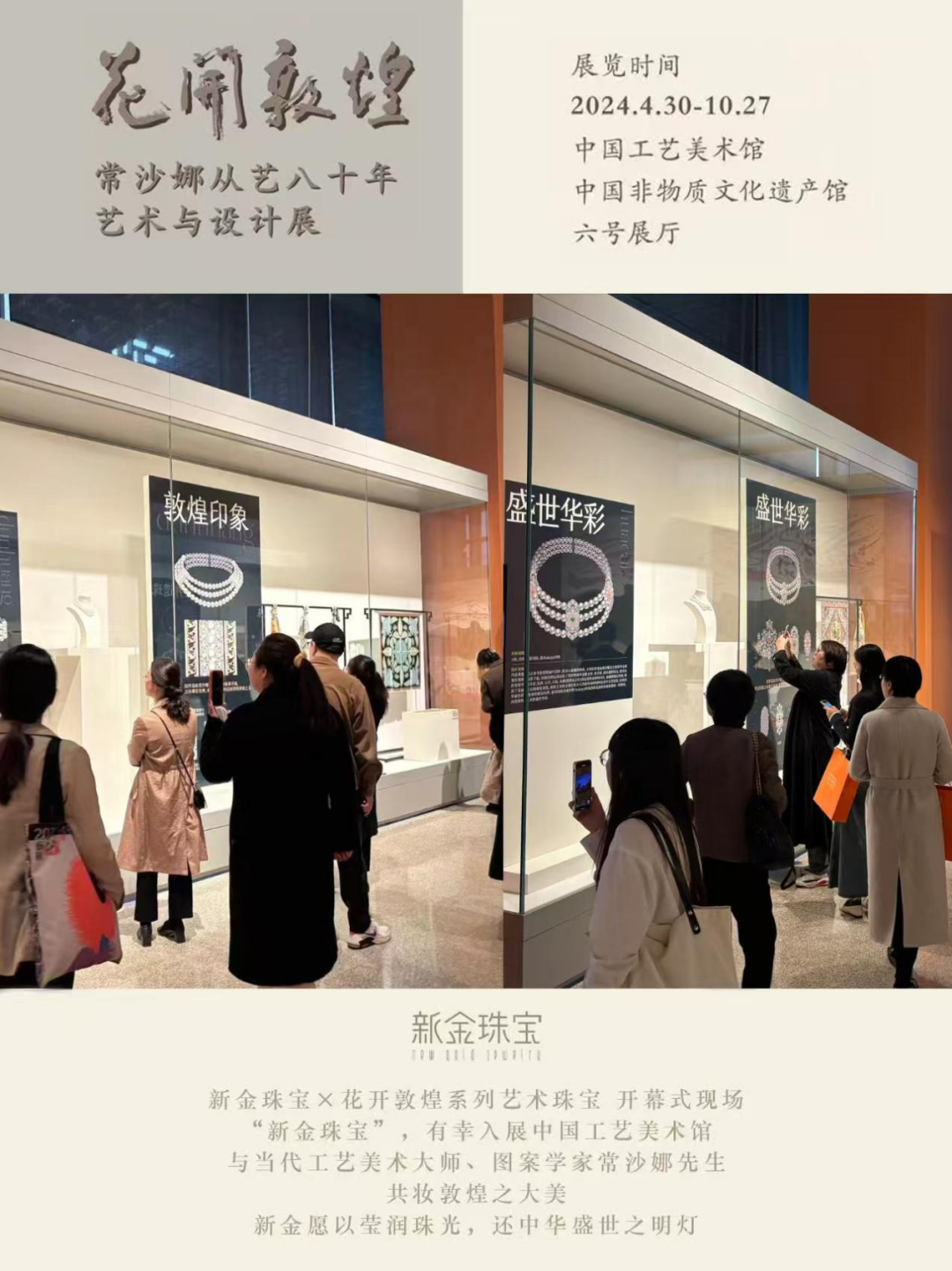 2024年4月30日,新金珠宝与世界级设计大师常沙娜先生联名设计作品——新金珠宝 ד花开敦煌”系列艺术珠宝,在2024年4月30日入展中国工艺美术馆。在为期半年的特展“花开敦煌——常沙娜从艺八十年艺术与设计展”上,与常沙娜先生设计的丝巾同窗共展。