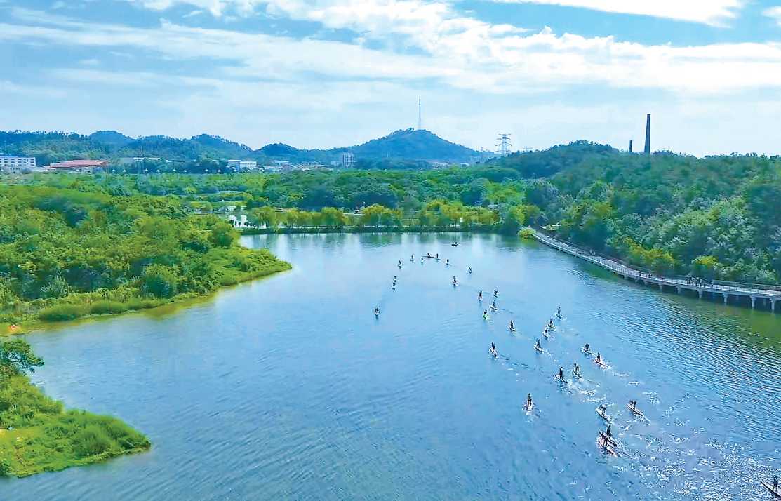 江夏区凤栖湖公园,桨板选手在湖面竞速。