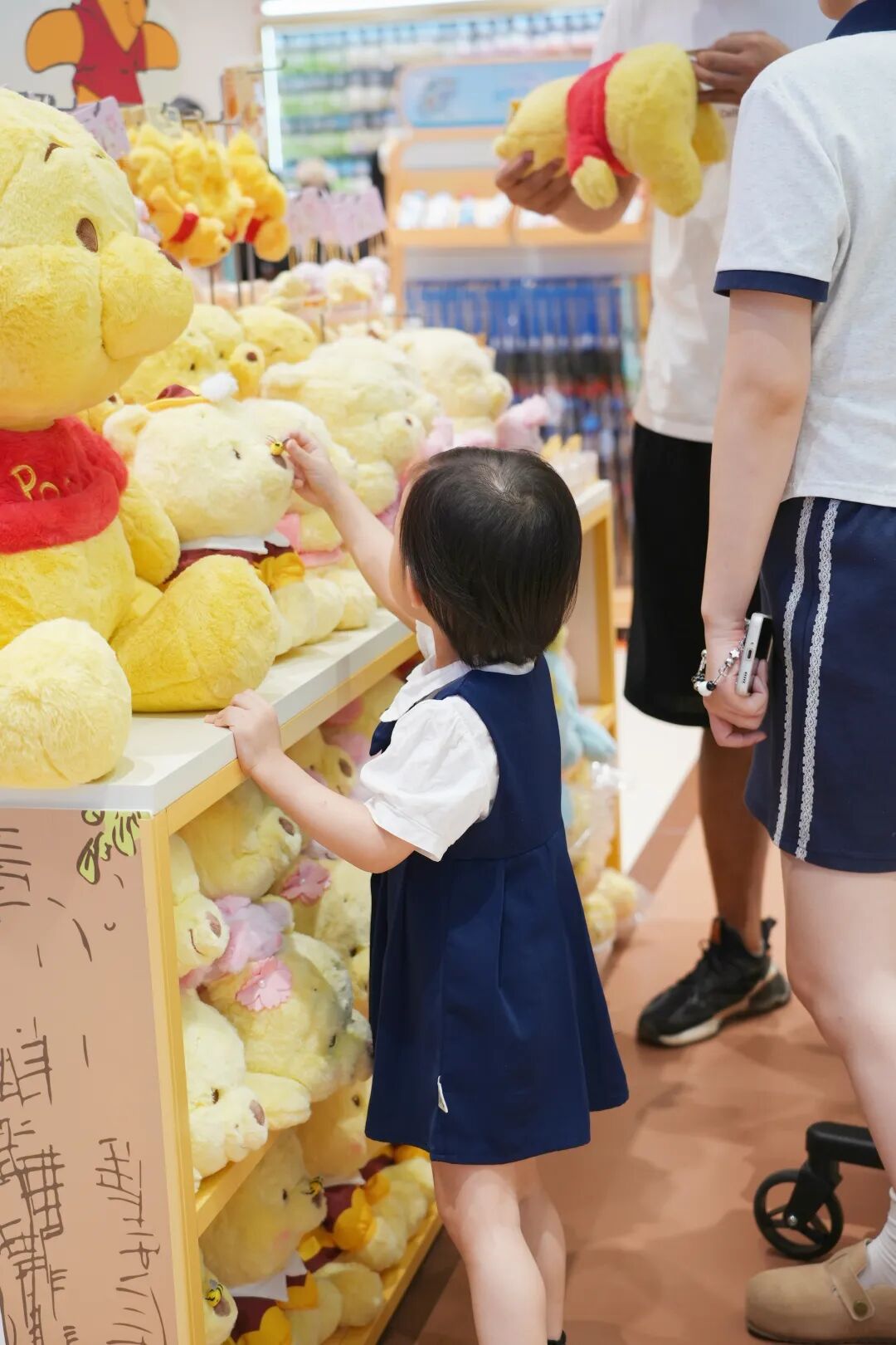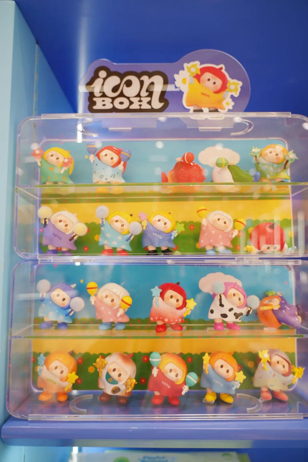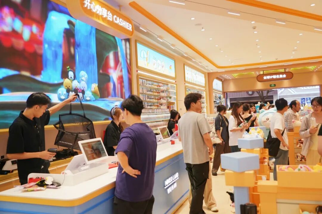 店内延续“场景化+策展式”设计思路,按IP类型与消费场景划分多个特色分区。全球IP联名集合区域汇聚了宝可梦、史迪奇、迪士尼、疯狂动物城、哈利·波特、Chiikawa、三丽鸥等全球热门IP,从史迪奇造型玩偶到蜡笔小新创意水杯,覆盖潮玩、家居、文具等多项品类。自有IP区则重点展示“右右酱”“墩墩鸡”等原创IP周边,其中“右右酱”ICON BOX系列盲盒因独特设计,成为不少消费者的“必入款”。