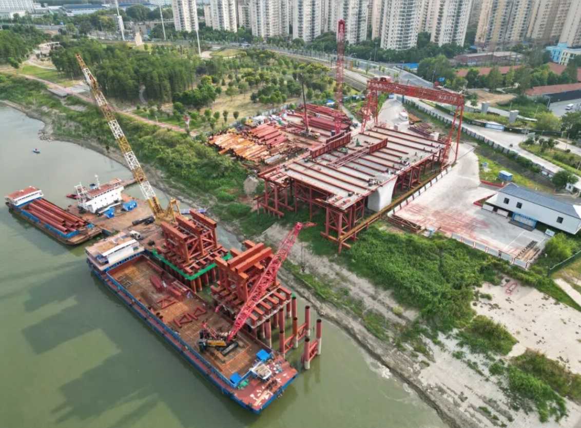 江心之上,数排临时的红色施工钢柱破水而出,稳稳地屹立于碧波之中,它们是为后续桥梁合龙搭建的关键施工平台。