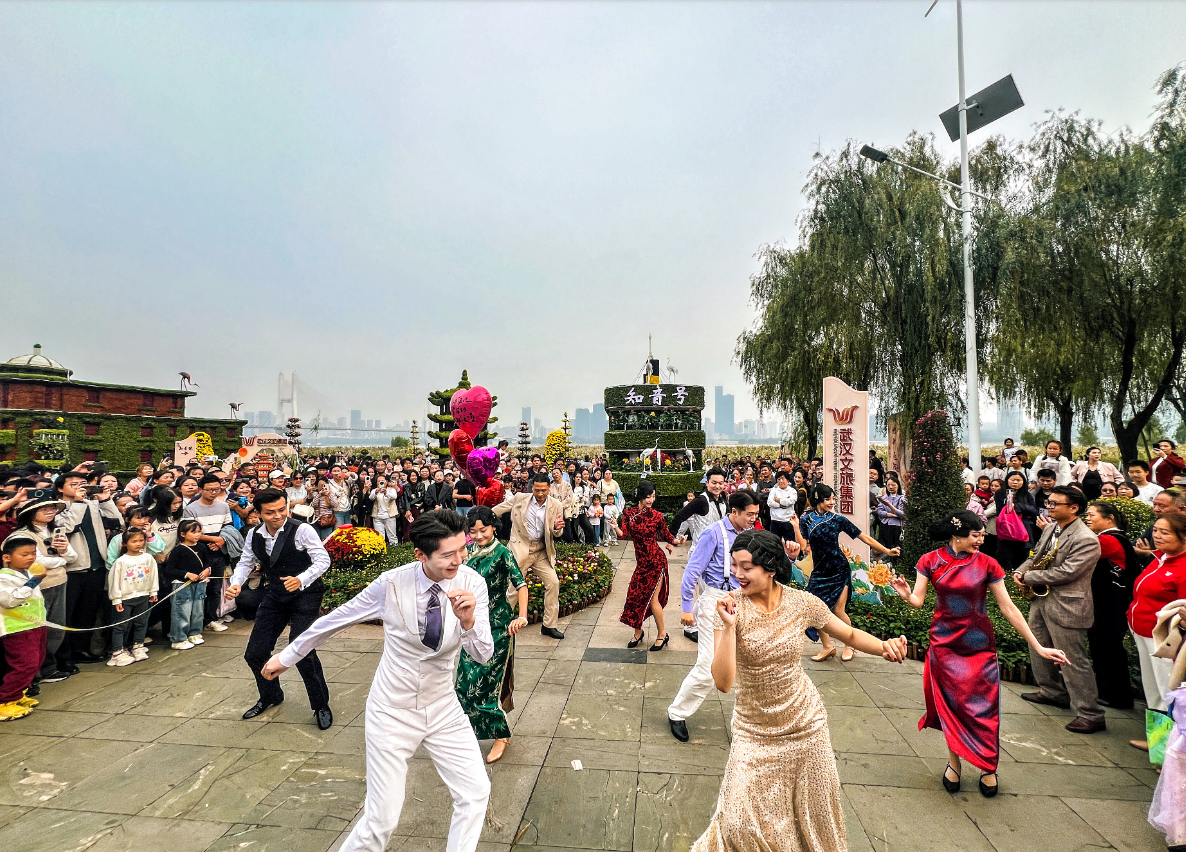 午后暖阳正好,江风轻拂,菊香浮动。正当游客们流连于绚烂花景时,一曲悠扬的复古旋律倏然响起,打破宁静。数位身着精致服饰的舞者翩跹而至,以灵动的身姿将长江文化与知音故事娓娓道来,引得围观人群阵阵掌声。