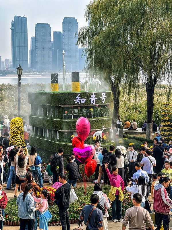 本届菊展以“金菊璀璨映江城 百姓园林绘新篇”为主题,主展区汉口江滩共展出万余盆精品菊花。而“知音号”等城市文化符号,也通过园艺师的巧思,以立体花境的形式呈现于游客眼前。