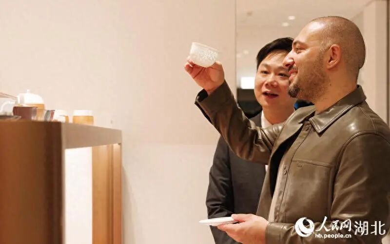 深秋时节,江城寒意渐起,武汉SKP商场内暖意融融、客流如织。在商场四楼的家居展柜前,来自意大利的拉斐尔正驻足欣赏一套精美的景德镇陶瓷茶具。茶杯通体莹润,在灯光照射下,叶片图案透出柔和的光线,搭配同系列杯碟与线香,尽显东方雅韵。