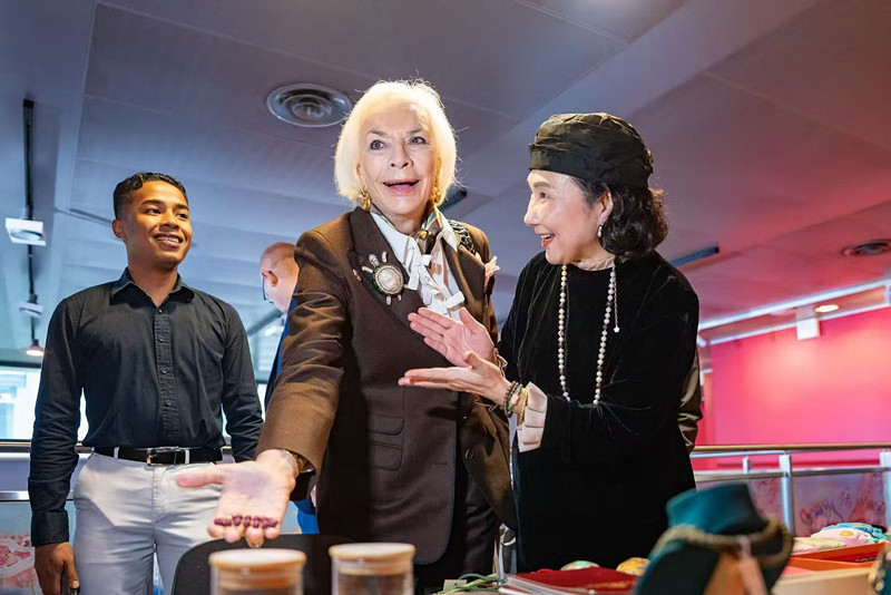活动现场,法国嘉宾与楚香非遗传承人韩雪交流,感受湖北楚香文化。