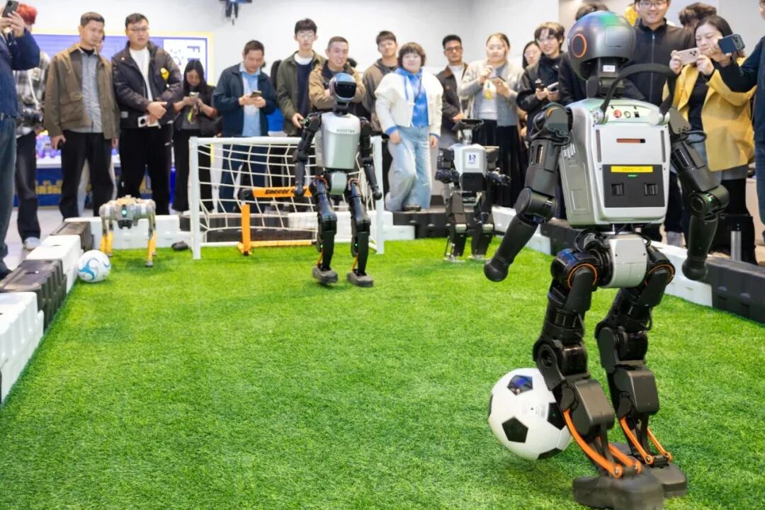 体验区是全场最热闹的地方。机甲对战、足球机器人对抗赛不断引来围观。孩子们兴奋地为“自己支持的机器人”加油。