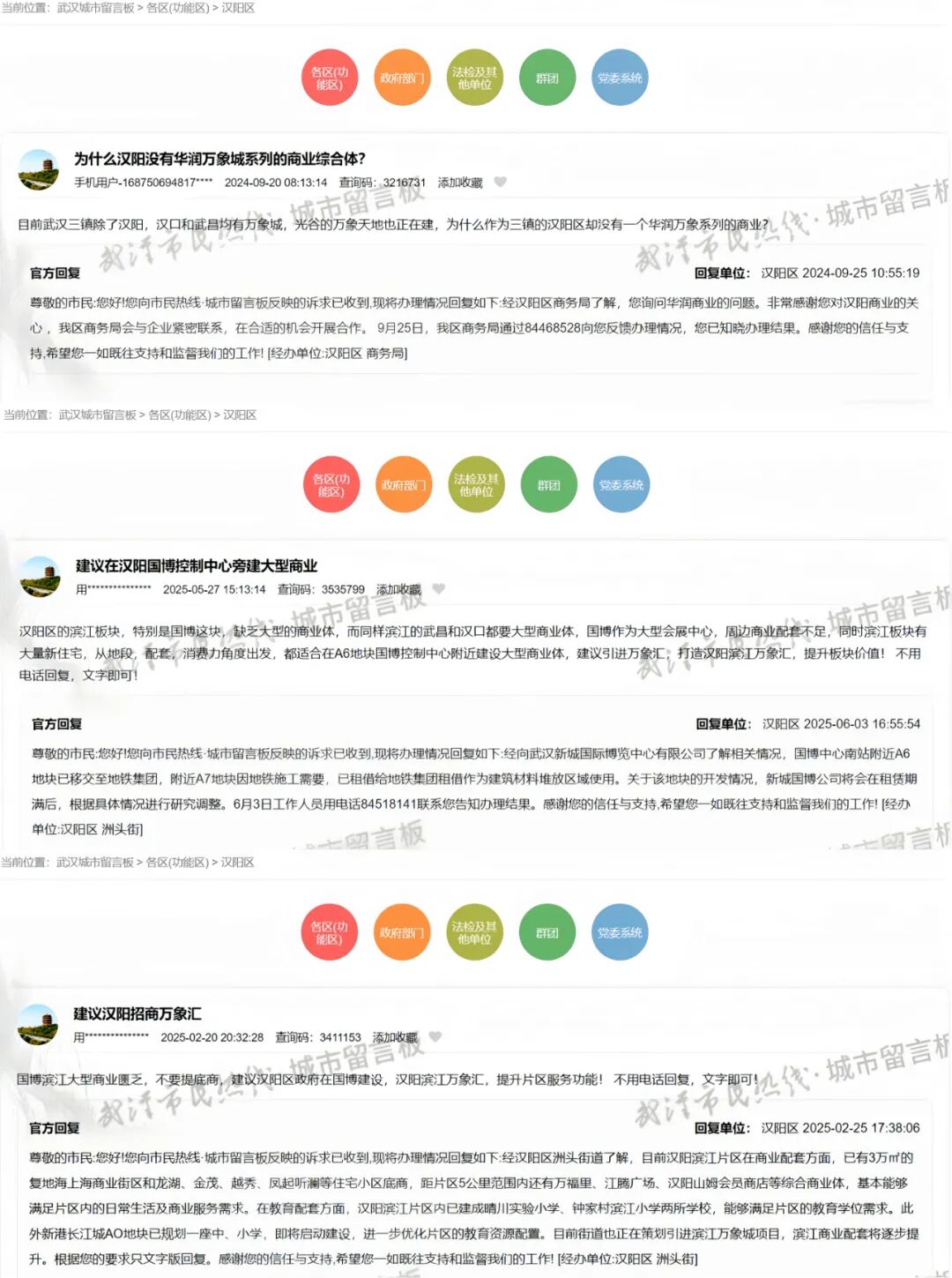 ○武汉城市留言板上有关汉阳与万象商业的建言。