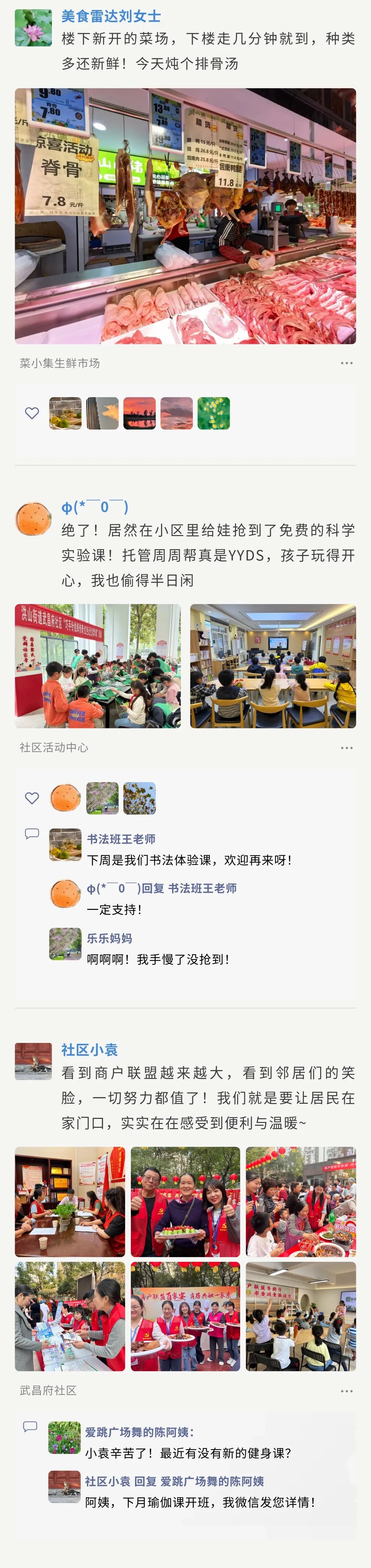 足不出圈,乐享美好,让幸福感落地生根。在武昌府社区及商户们的共同努力下,“商户联盟”的规模不断壮大,从刚开始的55户增长到如今的100多户,数量翻了一番。