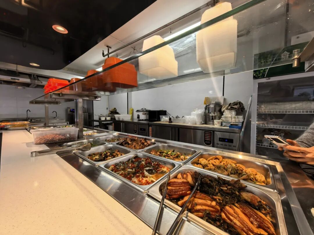 在食堂保温架上,既有梅菜扣肉、腐竹牛腩、糍粑鱼、回锅牛肉等可口大菜,也有肉末豆角、清炒油麦菜、青椒肉丝等家常小菜,还有各类卤菜,琳琅满目、丰俭由人,营养搭配也均衡。