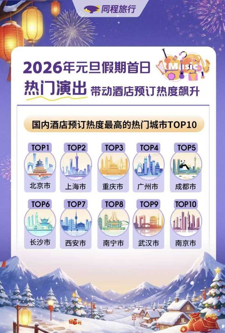 2026年元旦假期首日,全国文旅消费热潮全面点燃,年轻群体主导的“悦己消费”成为主流。来自同程、去哪儿、美团、途家等平台数据显示,武汉在元旦期间酒店、民宿预订热度位居全国前列,成为国内酒店热度TOP10城市之一。