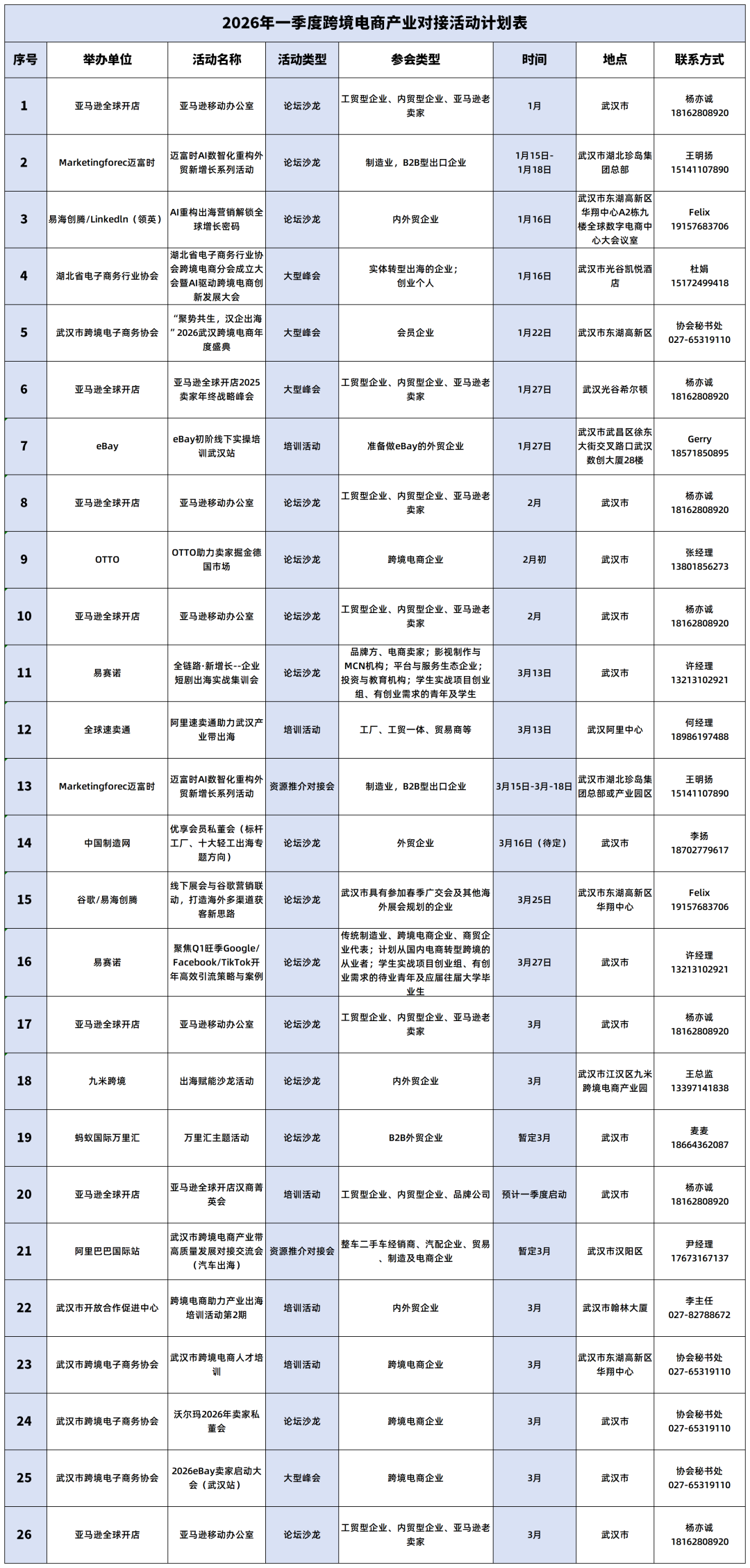 为持续推进跨境电商产业对接,助力全市企业链接新平台、拓展新市场,市商务局会同30余家重点平台、服务商、行业协会启动武汉市跨境电商助力产业出海行动,2026年拟在汉举办大型峰会、论坛沙龙、培训、资源推介等各类活动近百场次。小浪花先剧透一季度活动安排~