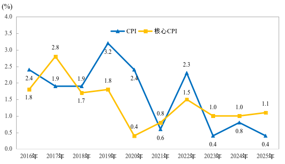 2016年—2025武汉市CPI、核心CPI涨跌幅。