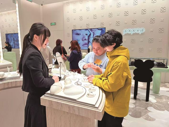 “今天我就是冲着cry baby来的,看上了一条1199元的项链,觉得造型特别可爱。”95后白领陈女士表示,自己平时就喜欢小众设计感的饰品,popop的IP首饰风格独特,不会撞款,搭配通勤装、休闲装都很合适。“我是泡泡玛特多年的老粉,从盲盒追到珠宝,有Molly IP的这款项链我盼了很久,既能戴出门,又能圆自己的收藏梦,比普通首饰更有情感共鸣。”00后大学生小周拿着刚买到的首饰,难掩兴奋。