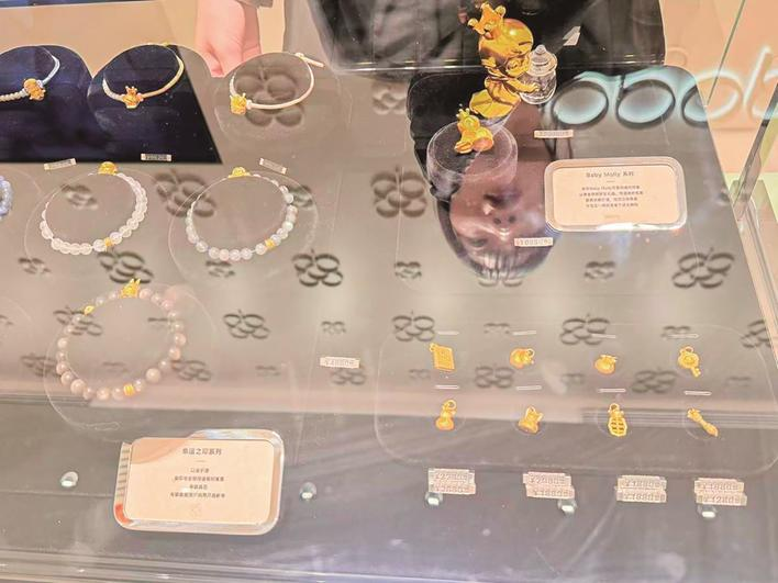 “Baby Molly足金系列”自上市以来,吸引了不少年轻人的关注。“很多顾客都是冲着Molly这个IP来的,尤其是年轻女孩,她们对这种有IP特色的黄金饰品接受度很高。”门店店员说道。展柜内,一款Baby Molly抱着奶瓶的黄金摆件,足金克重41克,门店售价为75980元;带有红绳的爱心黄金串珠售价为1580元,均为一口价饰品。