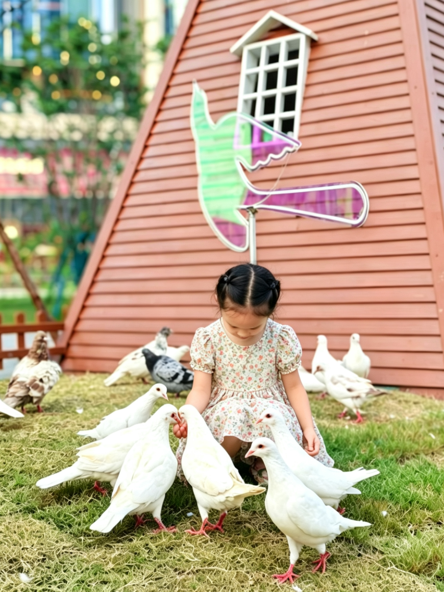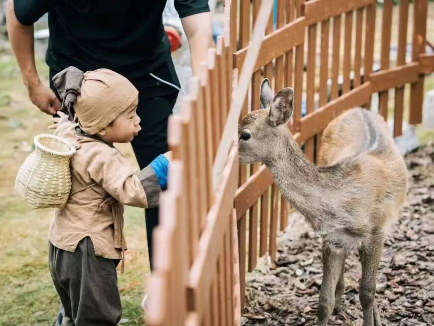 动物互动区:这才是真正的“流量密码”。白色攀爬网张开成“翅膀”,孩子们在上面爬上爬下;旁边的喂食区,小鹿、小羊、鸽子轮番“营业”,孩子们尖叫和大笑便是“治愈时刻”。