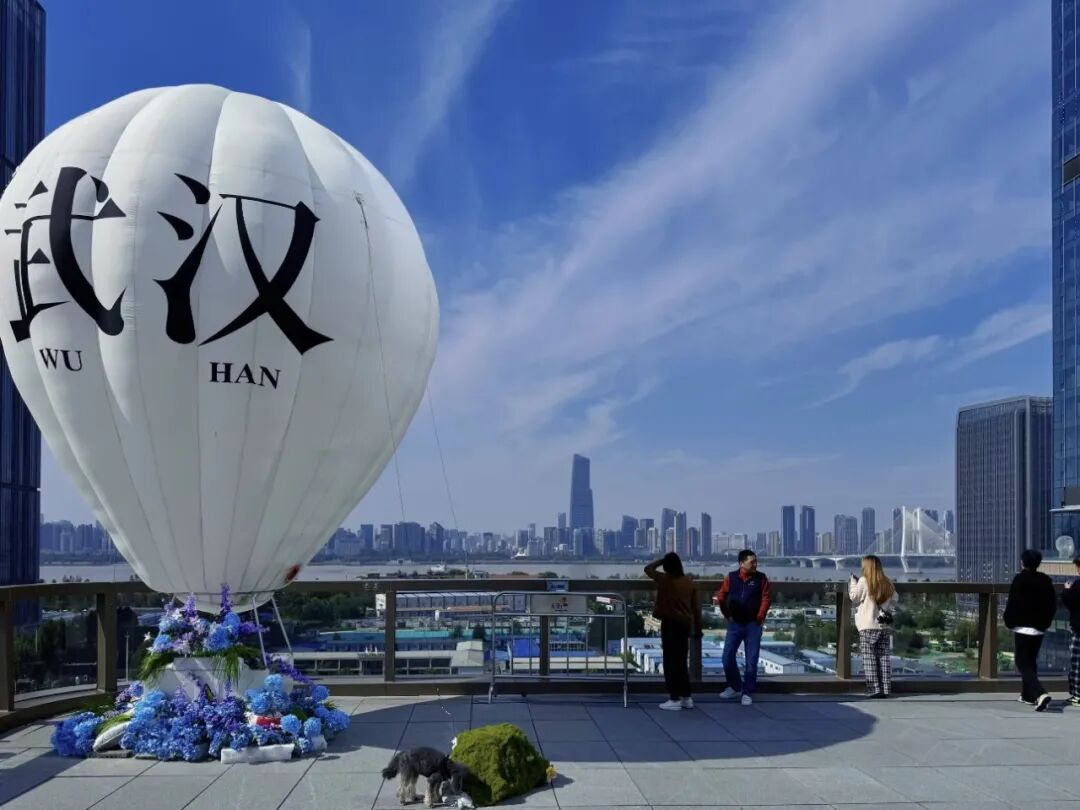 顶层露台:无遮挡的江景扑面而来,一个写着“武汉”的热气球在风中轻轻晃动。傍晚时分,年轻人排着队和“武汉”合影,背后是长江两岸亮起的万家灯火。