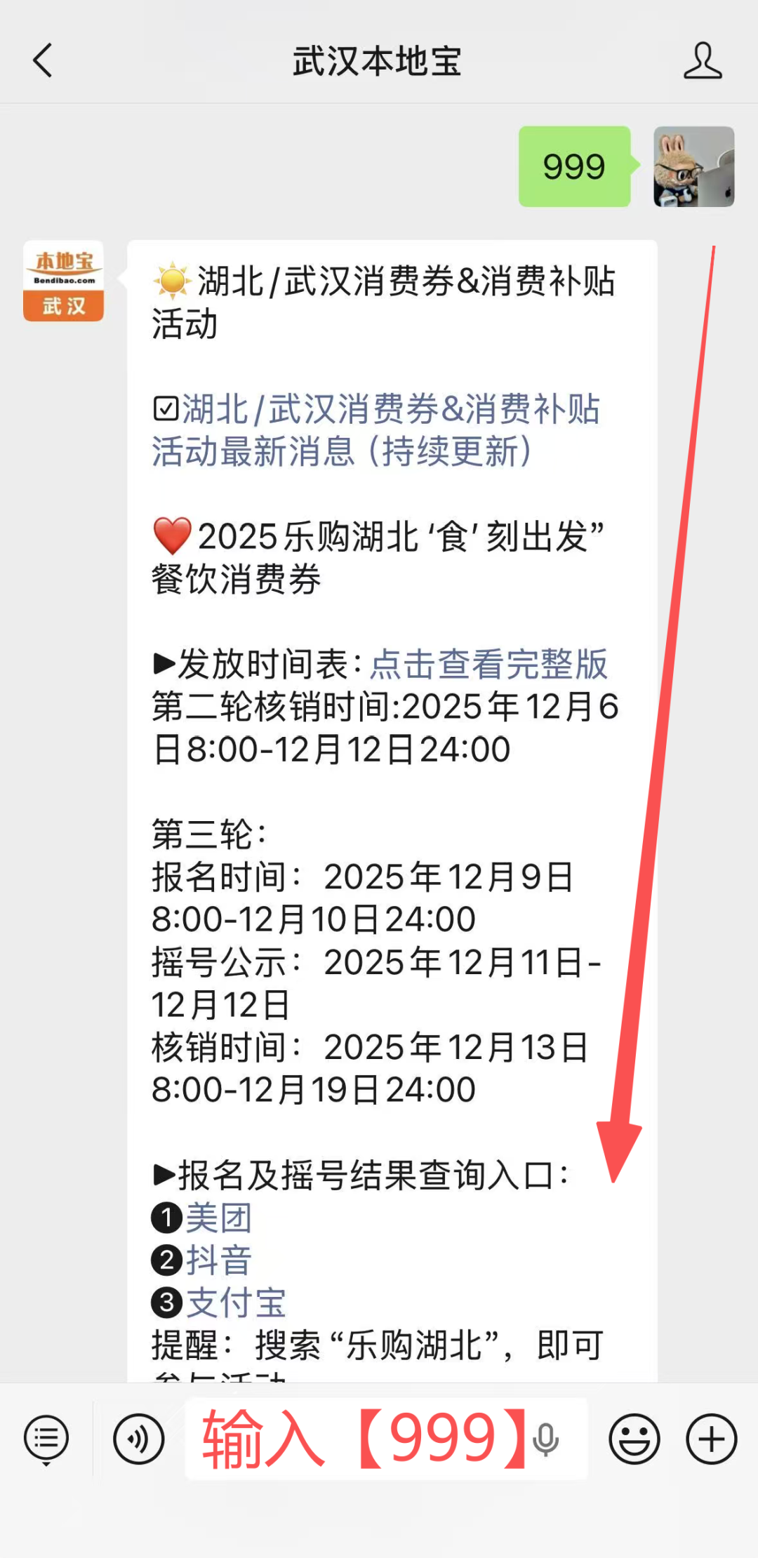 领券小助手:大家可前往支付宝、美团、抖音平台报名领取,也可以扫描下方二维码,进入【武汉本地宝】微信公众号,在微信聊天框输入【999】,即可快速获取消费券报名领取入口!