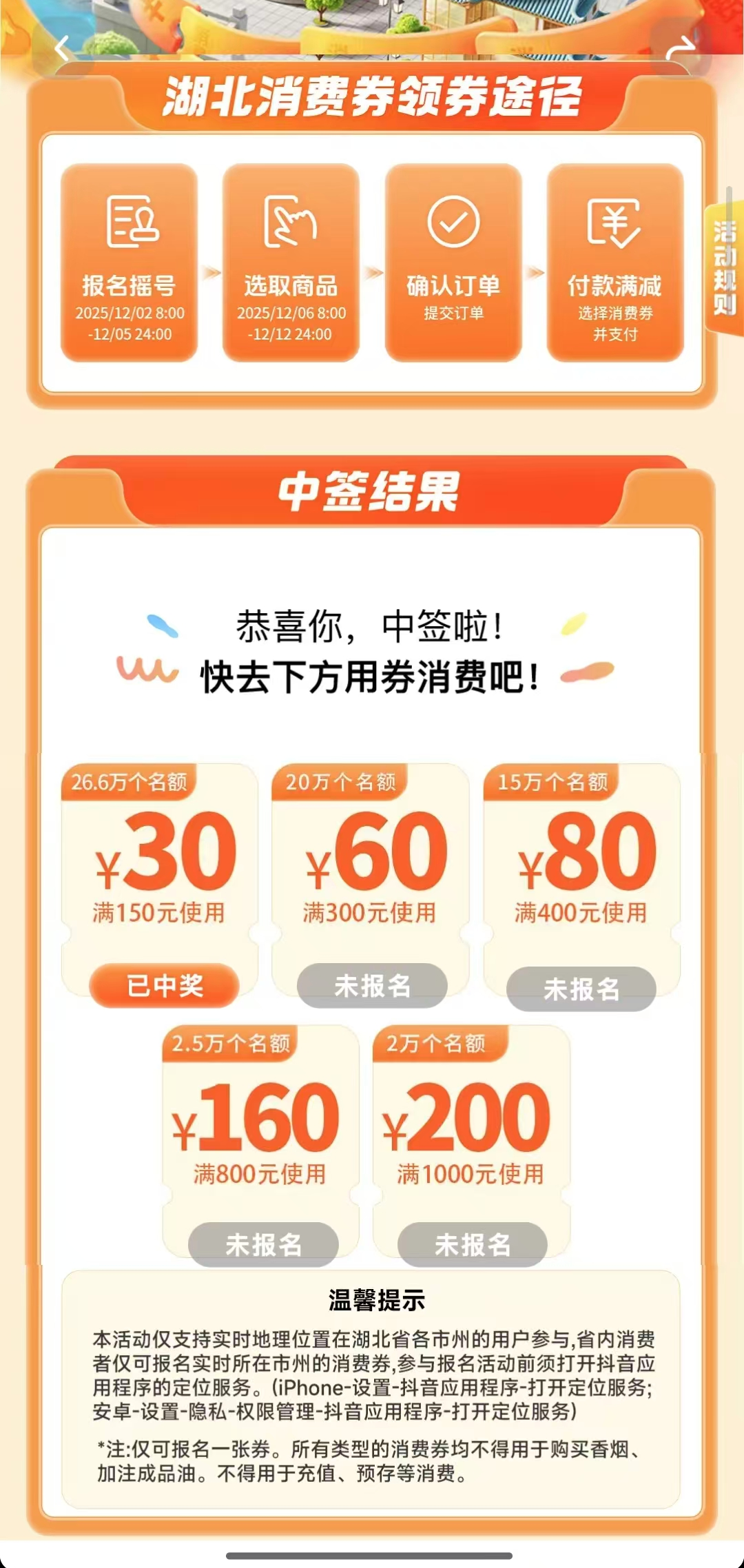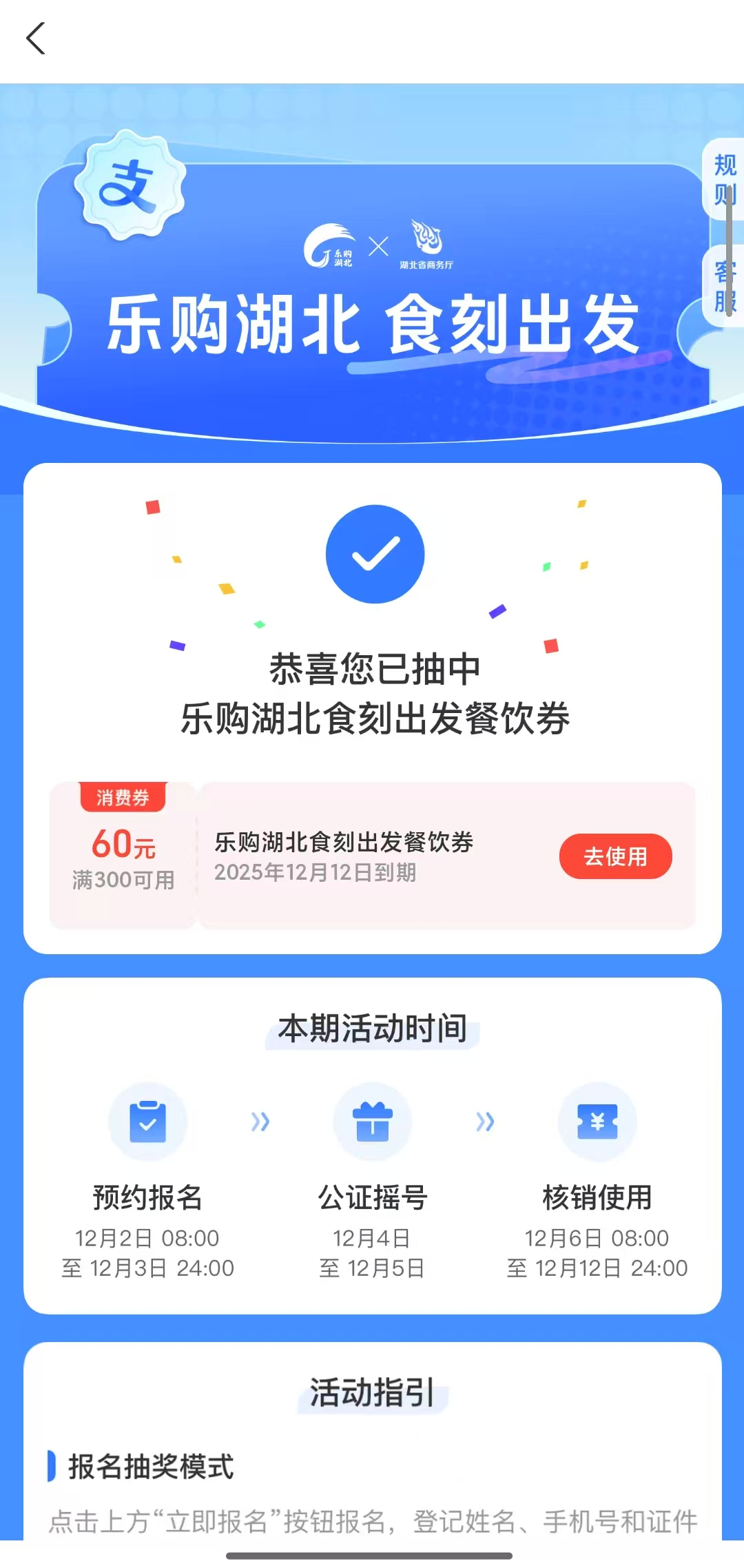 在领取平台的首页,搜索“乐购湖北”,抽奖详情页即可查看中签结果。