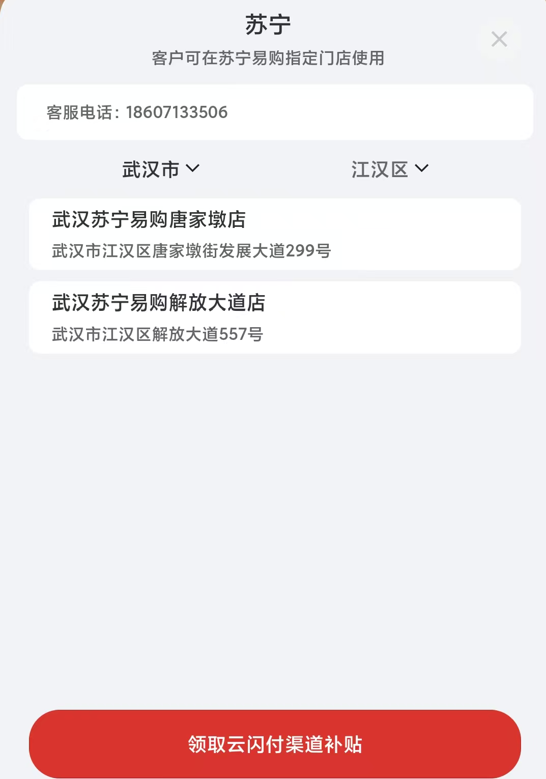 4、可查看附近可用的门店,点击“领取云闪付渠道补贴”。