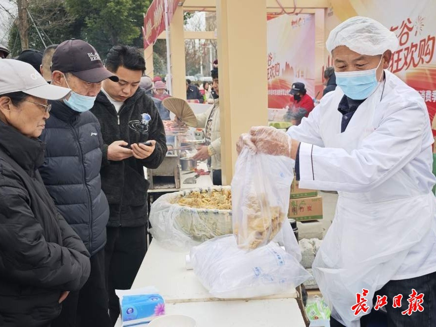 年货区内,吆喝声、询价声此起彼伏,升腾着热腾腾的烟火气。三十余家优质商户集中亮相,现炸的得胜圆子金黄酥脆、香气扑鼻,小军山豆丝、酥鱼等本土特产备受青睐,各色水果、炒货也围满了采购的市民。