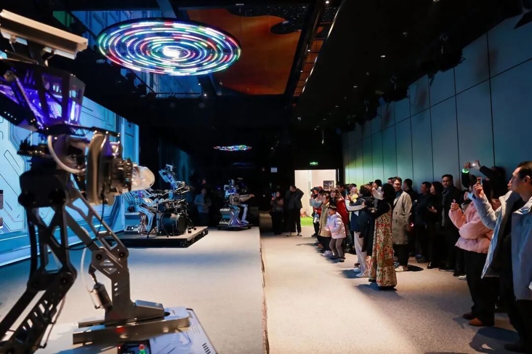 曾与王力宏同台演出的人形机器人伴随着音乐节奏,灵活地扭动腰胯,跳起恰恰舞。比武擂台上,春晚同款宇树科技G1机器人,一招一式,表演功夫。电影《机器人总动员》中的主角瓦力化身“百科全书”,耐心回答小朋友的提问。登上2026年山东春晚的“磐石机器人乐队”大显身手,鼓手的机械臂精准敲击,键盘手的手指左右飞舞,合奏了一首乐曲。体验过程中,大家还可以亲自上阵,操作机器人射箭、踢足球、做俯卧撑。