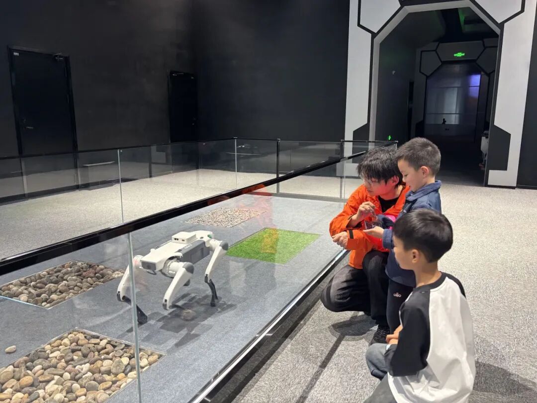 “快看快看,它会后空翻!”在工作人员的指引下,小朋友手持遥控器,指挥面前的机器狗凌空跃起,随即在布满石子的草坪上稳稳落地。周围举着手机的家长们发出一阵惊呼,几个胆大的孩子凑上前,伸手摸了摸机器狗的脑袋,机器狗摇头晃脑回应着大家的亲昵。