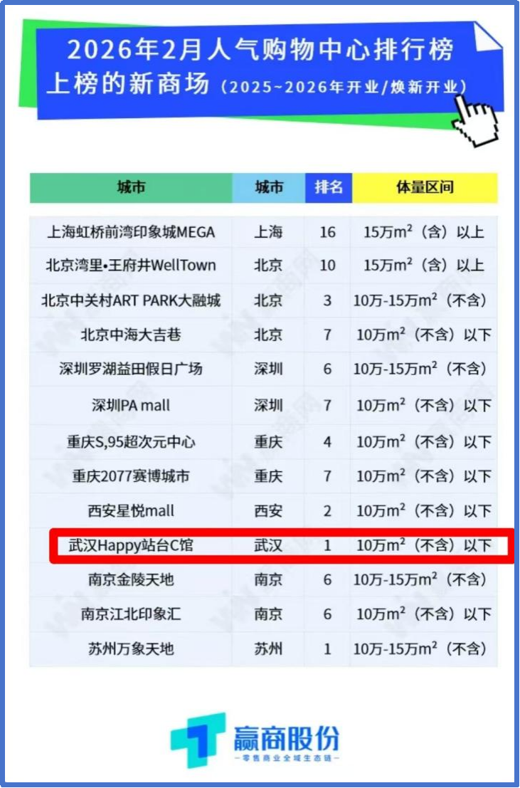 近日,赢商网发布行业观察,汉口江汉路Happy站台C馆凭借其精准的“年轻力”定位与颠覆性的场景创新,实力入选新上榜人气商场。